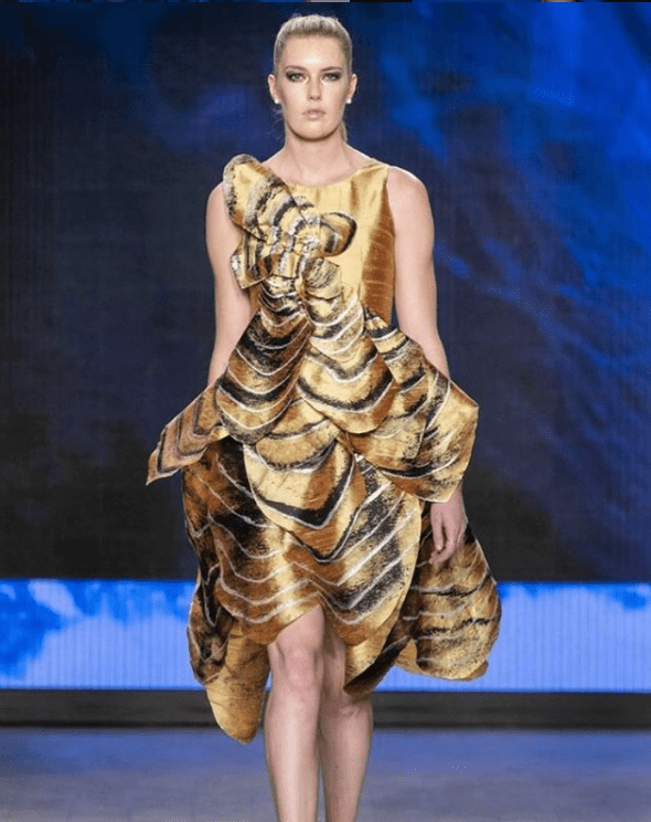 Yeah, I’m quite obsessed with Alexander McQueen, to be honest; he’s the greatest fashion designer ever in my eyes; he just is. Lots of people innovate fashion like Christine Dior with the new look and Chanel with her dress silhouettes. Still, it was all a long time ago, and when McQueen came around, it felt like we had seen everything, but he just implemented tailoring into a dress. It was crazy to me when I first saw his collection. I wasn’t even studying fashion, and when I saw this dress, I was like, “Woah, this is crazy,” his 2010 collection, there was a dress, not even the final piece. Still, it was a draped piece that goes around with a huge collar, and I saw it and wanted to pay homage to him because he was one of the reasons I got into fashion. I did a basic block and trimmings, and it was very fitted too, and I had to do a lot of samples. I did pattern drafting to make the bodice. I made the bubble skirt by draping as well as the neckpiece, but I started making it with paper because it’s cheap and you won’t waste money, I used different densities of paper and tried to copy it into a fabric that is stiffer and layered up to make it structured, so I used a combination of those two elements.